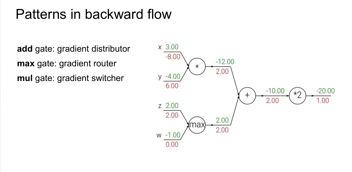 max gate는 연결된 브랜치 중 더 큰 입력값을 그대로 통과시켜 주며, upstream gradient도 통과시켜 준다. (단, 입력 값이 더 작은 브랜치 쪽의 gradient는 0이 된다.)