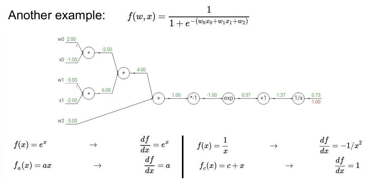 $\frac{1}{x}$ 노드를 q라고 칭했을 때, q 노드의 local gradient는 $-\frac{1}{x^2}$ 이며, upstream gradient는 $1$ 이다. 따라서 최종 gradient는 $-\frac{1}{x^2} \times 1 = \frac{-1}{1.37^2} \times 1 = -0.53$ 이다.