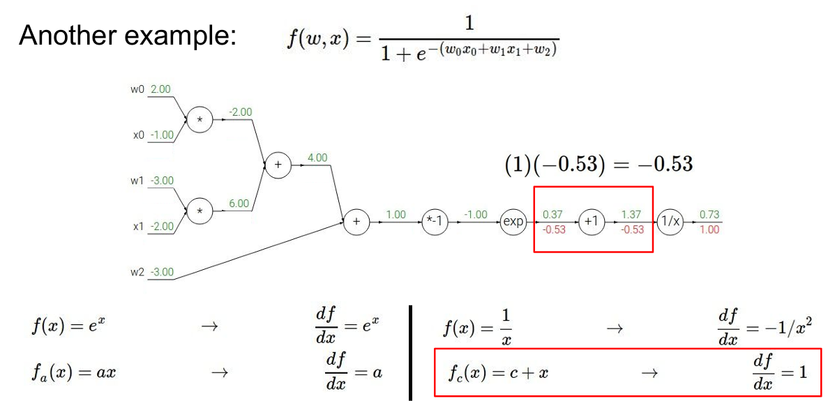 $x+1$ 의 local gradient는 $1$ 이며, upstream gradient는 $-0.53$ 이다. 따라서 최종 gradient는 $1 \times (-0.53) = -0.53$ 이다.