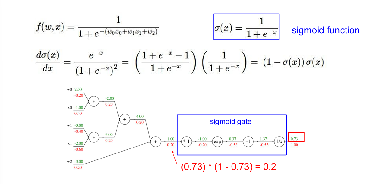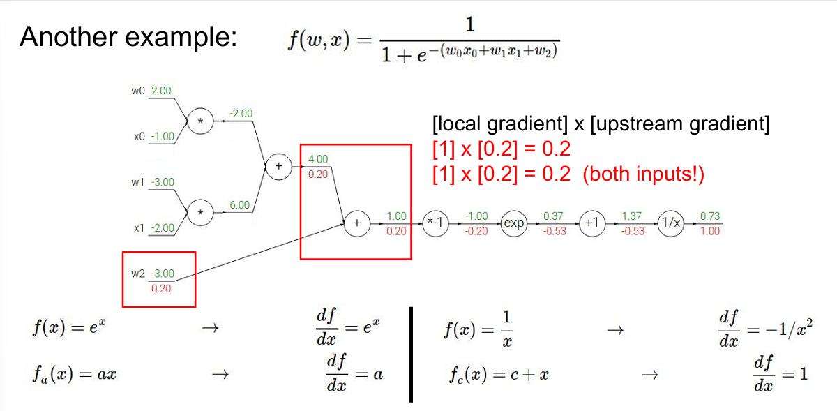 위 부분은 $w_0x_0 + w_1x_1$, 아랫 부분은 $w_2$ 이다. 여기서 upstream gradient는 0.20, local gradient는 각각 1이므로 최종 gradient는 0.2 로 동일하다.