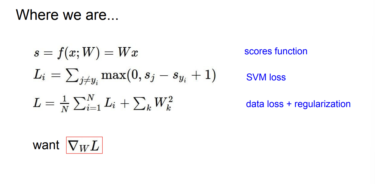 우리는 지난시간 raw data로부터 class score를 구하는 scores function, function이 얼마나 구린지를 정량화할 수 있는 SVM loss, 분류기를 일반화 할 수 있는 regularization 에 대해 배웠다.