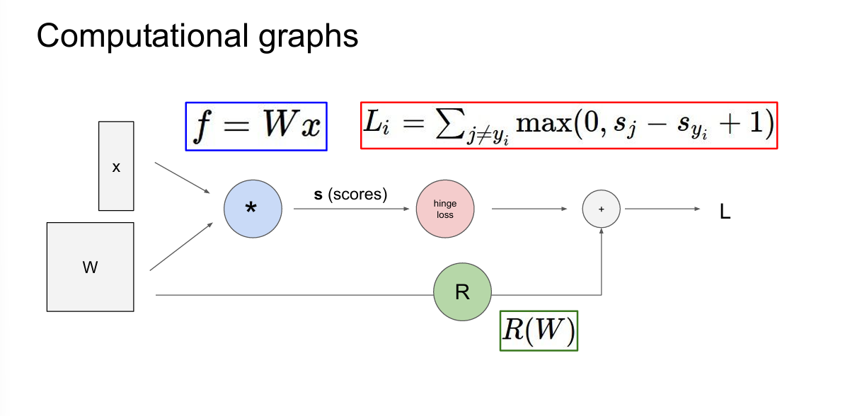 이 예제는 input이 $x$, $W$인 선형 classifier를 Computational graph로 나타낸 것이다.
