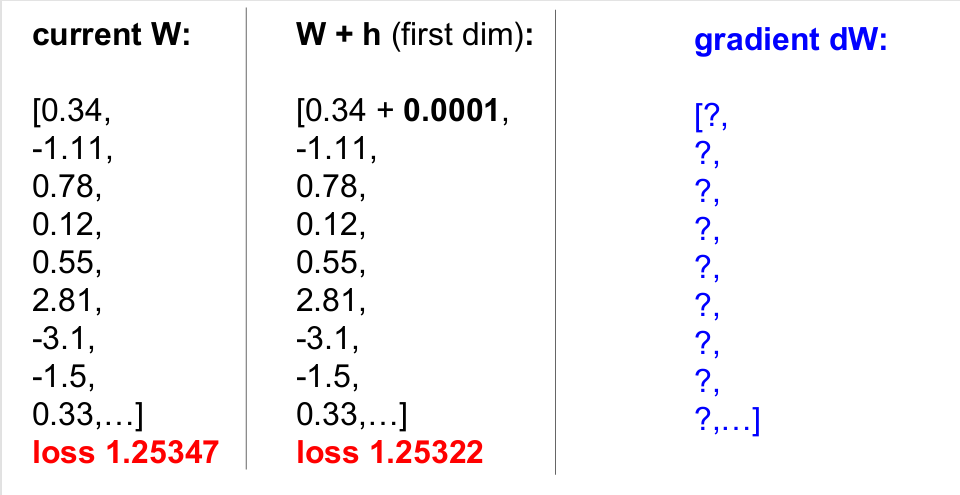 이는 $W$의 첫번째 요소를 조금 변화(양의 방향으로)시킬 때 Loss가 1.25347에서 1.25322로 감소한다는 뜻이다.