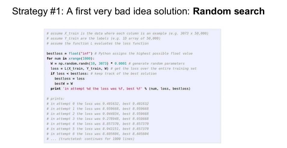 가장 먼저 생각해 볼 수 있는 단순한 방법은 임의 탐색(Random search) 이다. 임의로 샘플링한 $w$들을 모아놓고 Loss를 계산해서 어떤 $w$가 좋은지 살펴보는 것이다. 당연히 이 방법은 좋지 않은 알고리즘이지만 한번쯤 생각해 볼 법한 방법이다.