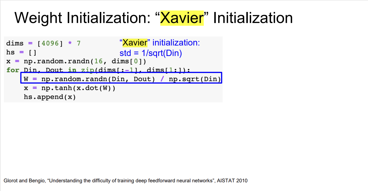 따라서, 우리는 다음과 같은 $W$ 초기화를 통해 입력과 출력의 분산을 맞춰줄 수 있게 된다.