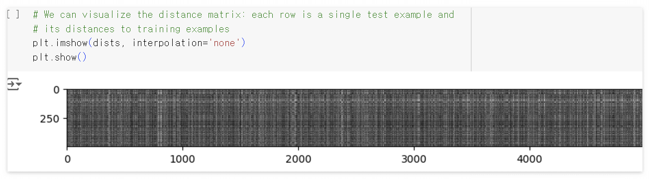 Your Answer : 1. distance matrix의 각 행(row)은 단일 테스트 샘플과 모든 훈련 샘플 간의 거리를 나타냅니다. 테스트 샘플이 훈련 샘플과 픽셀 값에서 차이가 클수록 $L_2$ 가 더 커지며, 더 밝게 보입니다.