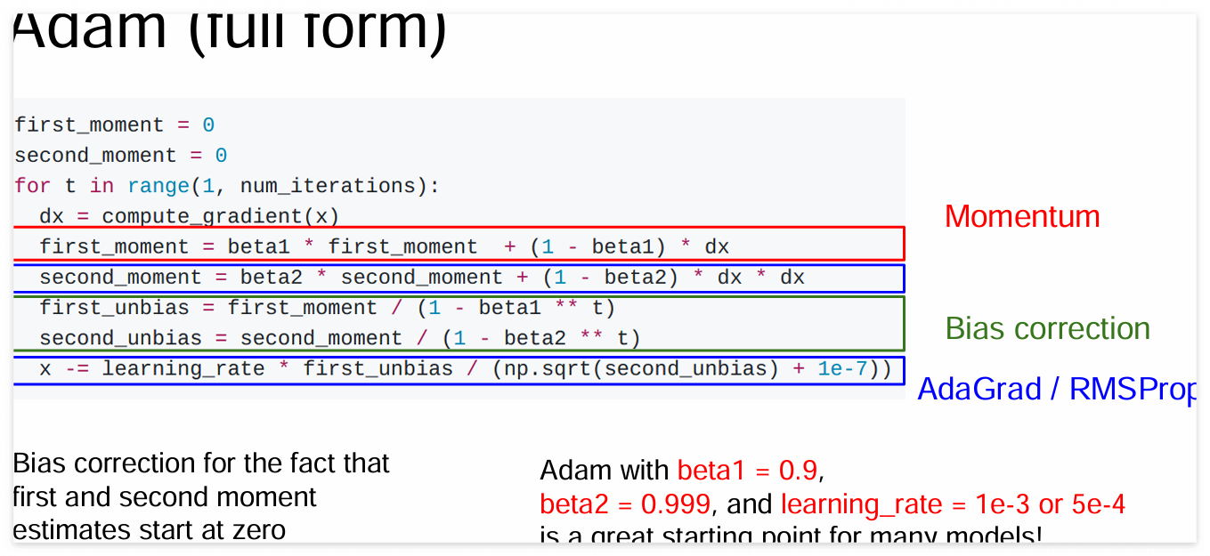 위 내용은 CS231n 강의 중 RSMProp과 Adam 슬라이드를 참고하면 이해하기 편합니다.