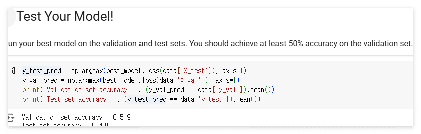 최종적으로 하이퍼 파라미터 튜닝을 통해 Validation set accuracy를 50% 이상으로 올려줍니다.