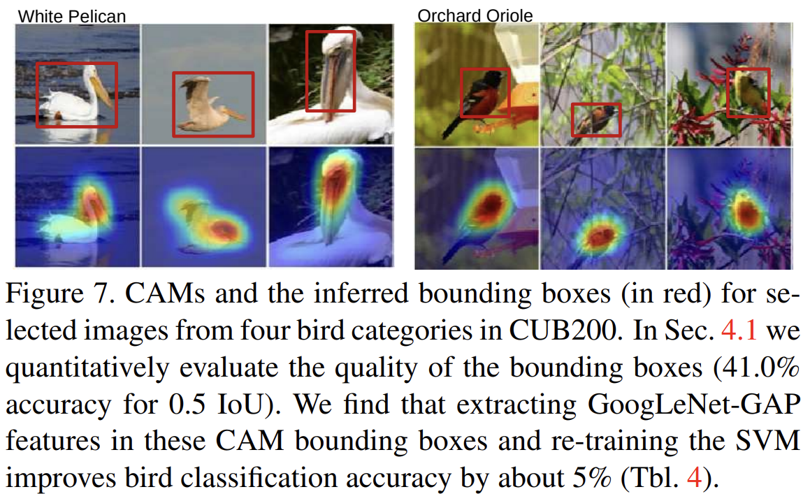 Fig 7은 CUB200 데이터셋의 새(bird) 카테고리에 속하는 일부 이미지에서 생성된 CAM과 추론된 바운딩 박스(빨간색)를 보여줍니다. IOU 0.5 기준에서 41.0%의 정확도를 달성했습니다.