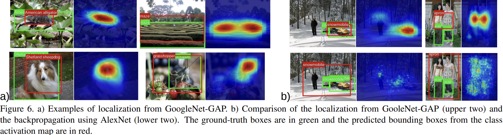 Fig 6은 위 방법을 사용해 생성된 바운딩 박스의 예시입니다. a)는 GoogleNet-GAP의 localization 예시, b)는 GoogleNet-GAP(위 두개)과 backpropagation 방법을 사용한 AlexNet(아래 두개)의 예시를 비교한 결과입니다. 빨간색 박스는 예측된 박스를, 초록색 박스는 ground-truth 박스를 나타냅니다. CNN-GAP 방법이 backpropagation 방법보다 box 위치를 더 잘 찾은 것 같습니다.