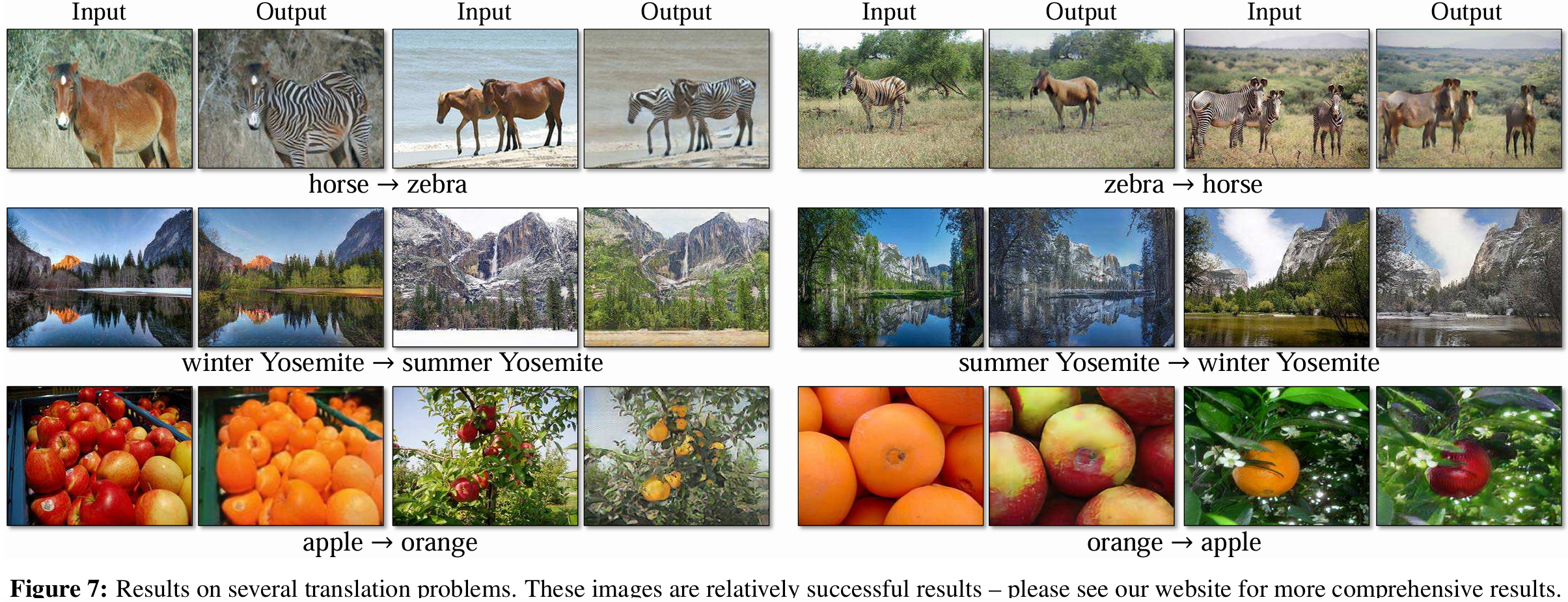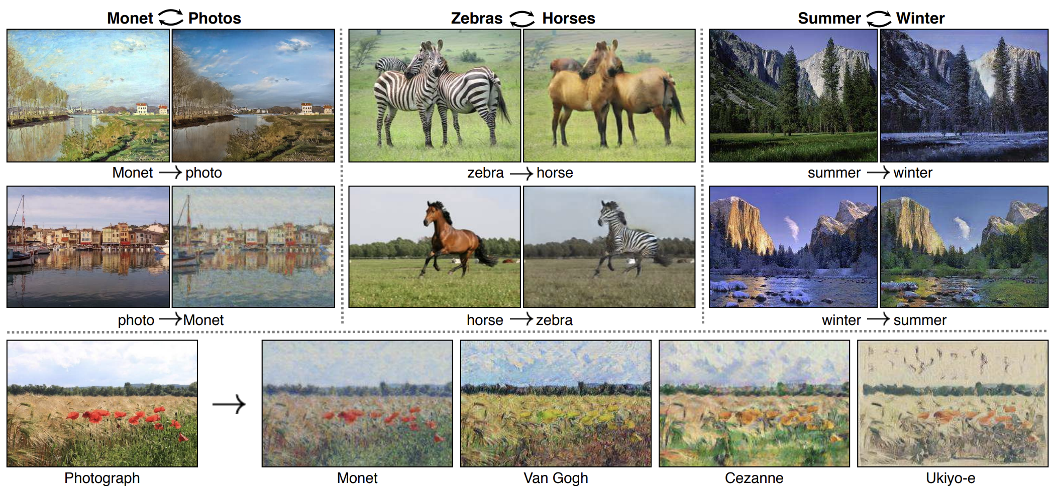 GAN은 이미지 생성, 이미지 편집, 표현 학습(representation learning), text2image, 이미지 복원, 미래 예측 등 다양한 분야에 사용되고 있다. GAN의 성공의 핵심 요인은 적대적 손실(adversarial loss)에 있다. 이는 생성된 이미지가 실제 이미지와 구분할 수 없도록 만드는 방식이다. 본 논문에서는 이러한 적대적 손실을 사용해 매핑을 학습함으로써, 변환된 이미지가 타깃 도메인의 이미지와 구분될 수 없도록 한다.