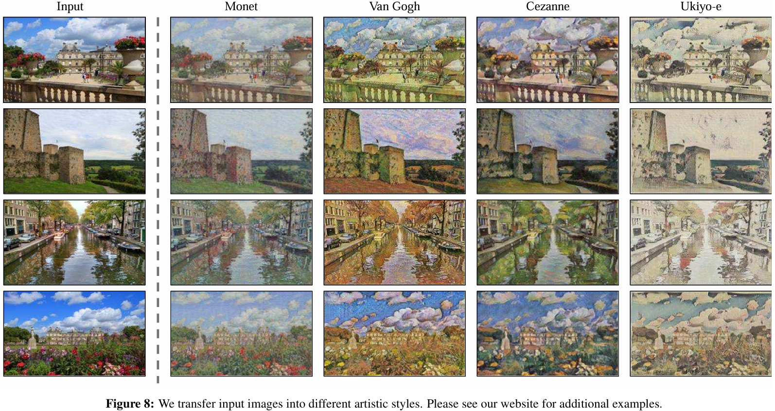 Fig 8에서는 Collection Style Transfer 를 확인할 수 있다. 본 논문에서는 Neural style transfer 연구와는 달리, 특정 작품 하나의 스타일을 전이하는 것이 아니라, 전체 예술 작품의 집합(예: 고흐 작품)의 스타일을 모방하도록 학습한다고 한다.