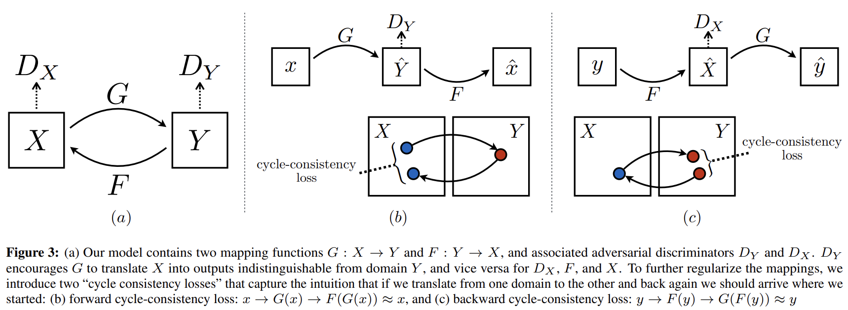 Image-to-image translation을 위해, $x \rightarrow G(x) \rightarrow F(G(x)) \approx x$를 만족시켜야 한다. 이를 forward cycle consistency라고 부른다. Figure 3 (b), (c)에서 보여진 것 처럼, 도메인 Y의 각 이미지 y에 대해서도 backward cycle consistency를 만족해야 한다. (즉, $y \rightarrow F(y) \rightarrow G(F(y)) \approx y$)