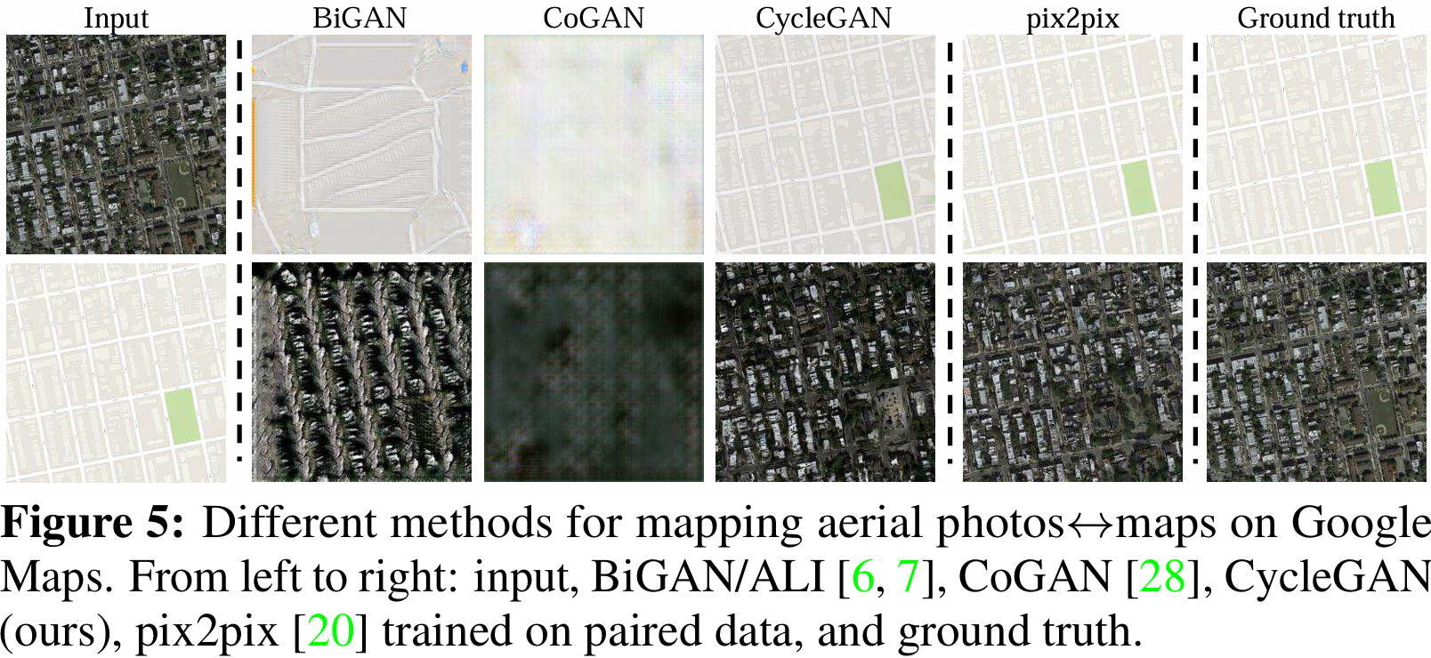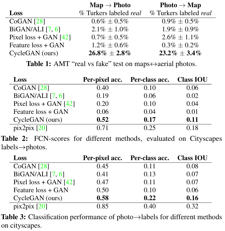 Fig 4와 Fig 5에서 볼 수 있듯이, 기준 모델들 중 어떠한 것도 설득력 있는 결과를 얻는 데 실패했다. 반면, 본 논문에서 제안한 CycleGAN은 지도 학습 방식인 pix2pix와 비슷한 품질의 translation을 생성할 수 있었다고 한다.