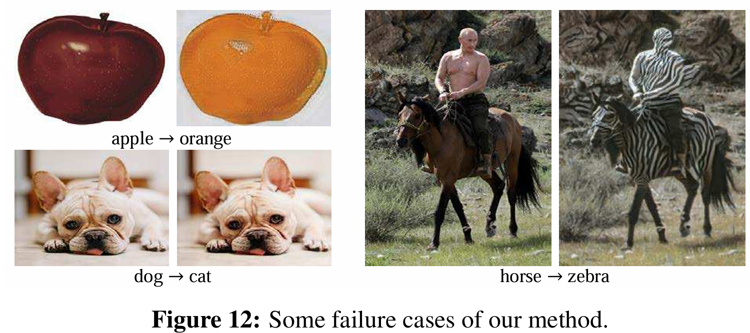 CycleGAN이 unsupervised learning 기반 image-to-image translation 에서 많은 경우에서 설득력 있는 결과를 달성했지만, 결과가 항상 긍정적인 것은 아니라고 한다. 대표적인 예시는 Fig 12에 나타나 있다.